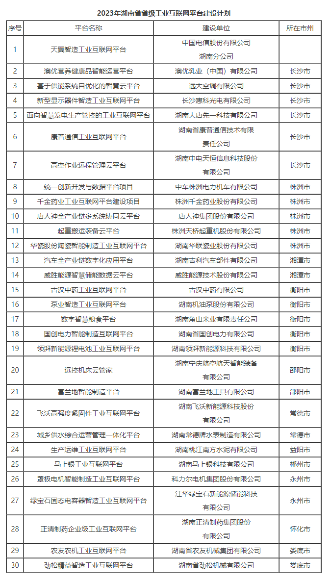 為深入開展“智賦萬企”行動,持續(xù)建設省級工業(yè)互聯(lián)網(wǎng)平臺體系,加快企業(yè)數(shù)字化轉(zhuǎn)型,打造國家重要先進制造業(yè)高地,經(jīng)企業(yè)申報、市州推薦、現(xiàn)場答辯、專家評審等程序,省工信廳同意天翼智造工業(yè)互聯(lián)網(wǎng)平臺等30個項目列入2023年湖南省省級工業(yè)互聯(lián)網(wǎng)平臺建設計劃,現(xiàn)予發(fā)布。