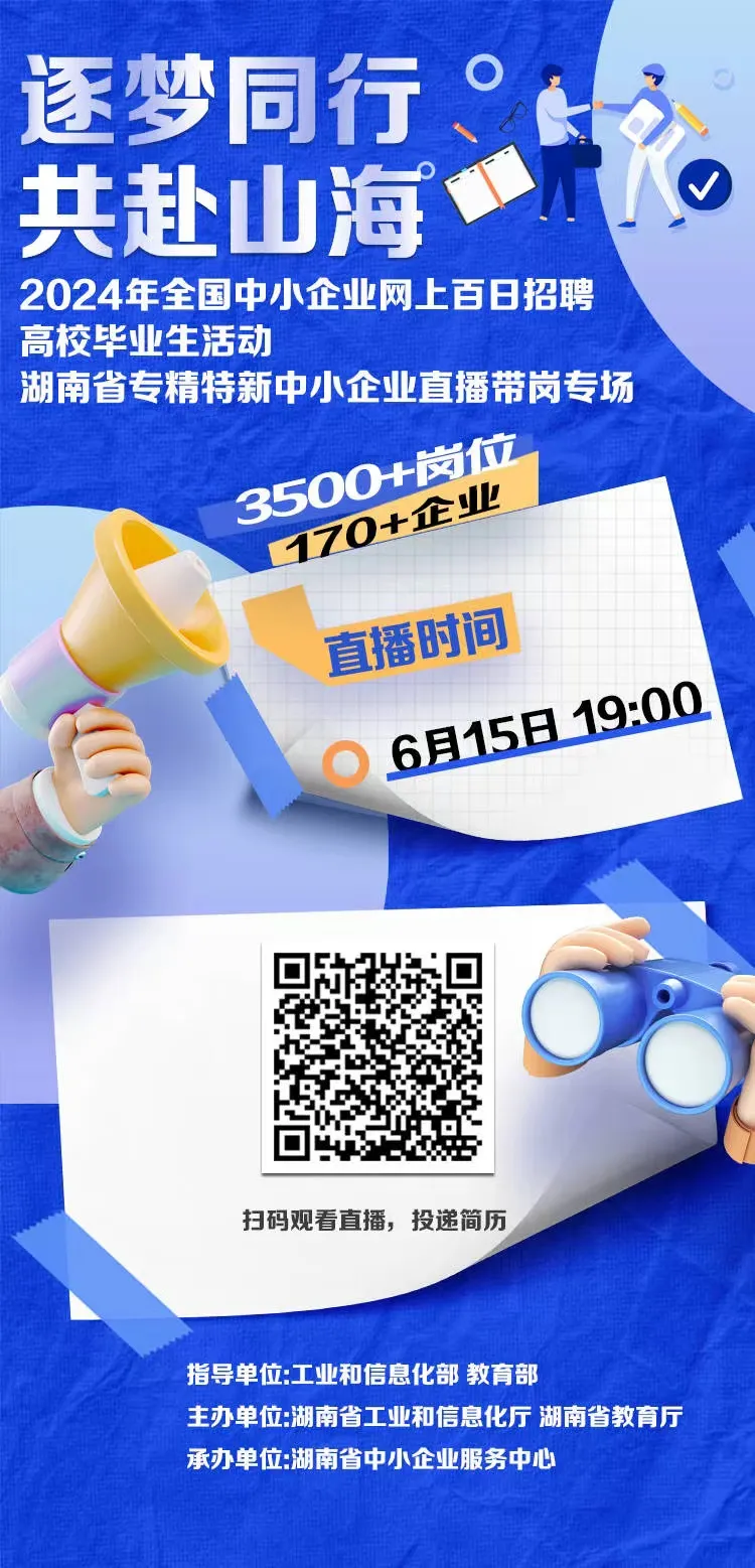 為貫徹落實(shí)黨中央、國(guó)務(wù)院關(guān)于穩(wěn)就業(yè)的決策部署和省委、省政府工作要求,進(jìn)一步推進(jìn)高校畢業(yè)生充分就業(yè)和專精特新中小企業(yè)人才供給工作,根據(jù)工信部辦公廳、教育部辦公廳《關(guān)于開展2024年全國(guó)中小企業(yè)網(wǎng)上百日招聘高校畢業(yè)生活動(dòng)的通知》要求,由省工信廳、省教育廳聯(lián)合主辦,省中小企業(yè)服務(wù)中心承辦的2024年湖南省專精特新中小企業(yè)直播帶崗活動(dòng)將在6月15日舉行。本場(chǎng)直播活動(dòng)將邀請(qǐng)5家省內(nèi)優(yōu)秀企業(yè)進(jìn)行崗位推薦,還有產(chǎn)業(yè)、人才、服務(wù)政策介紹。